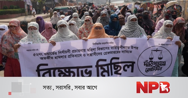 ঢাকা-৪ আসনের নির্বাচনী প্রচারণায় নারী নেত্রীর ওপর বর্বরোচিত হামলার প্রতিবাদে রাজধানীর কদমতলীতে বিক্ষোভ মিছিল করেছে বাংলাদেশ জামায়াতে ইসলামীর কদমতলী থানার মহিলা বিভাগ।