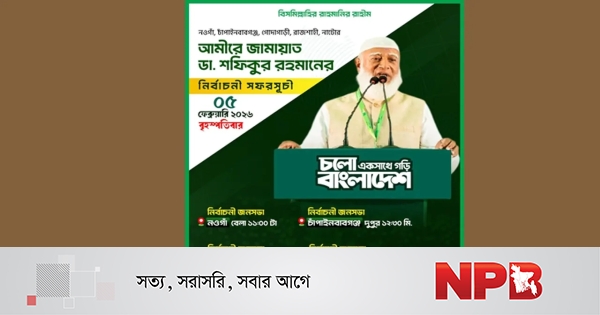 জামায়াত নেতারা জানান, আজ সকালে ডা. শফিকুর রহমান চাঁপাইনবাবগঞ্জে নির্বাচনি জনসভায় বক্তব্য দেবেন। দুপুরে তিনি আসবেন রাজশাহীর গোদাগাড়ী উপজেলায়। গোদাগাড়ী মহিলা ডিগ্রি কলেজ মাঠে আয়োজিত জনসভায় তিনি ভাষণ দেবেন। সেখান থেকে বিকেলে রাজশাহী মহানগরীর ঐতিহাসিক মাদ্রাসা মাঠের জনসভায় যোগ দেবেন জামায়াতের আমির। এর আগে তিনি নওগাঁয় এক জনসভায় বক্তব্য রাখনে। রাজশাহীর পর তিনি যাবেন নাটোর। সেখানে আজ সন্ধ্যায় তিনি জনসভায় বক্তব্য রাখবেন।