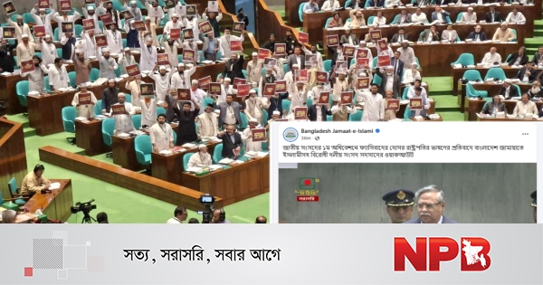 বৃহস্পতিবার (১২ মার্চ) বিকেলে জাতীয় সংসদের কার্যপ্রণালী অনুযায়ী ভাষণ দিতে রাষ্ট্রপতিকে অনুরোধ জানান স্পিকার হাফিজ উদ্দিন। এ সময় বিরোধী দল জামায়াতের সংসদ সদস্যরা দাঁড়িয়ে প্রতিবাদ জানান। তাদের হাতে প্ল্যাকার্ড দেখা যায়। প্ল্যাকার্ডে ‘জুলাই নিয়ে গাদ্দারি চলবে না’, ‘জুলাইয়ের সঙ্গে বিশ্বাসঘাতকতা বন্ধ কর’–সহ বিভিন্ন স্লোগান লেখা রয়েছে। স্পিকার এ সময় সবাইকে শান্ত থাকতে আহ্বান জানান।