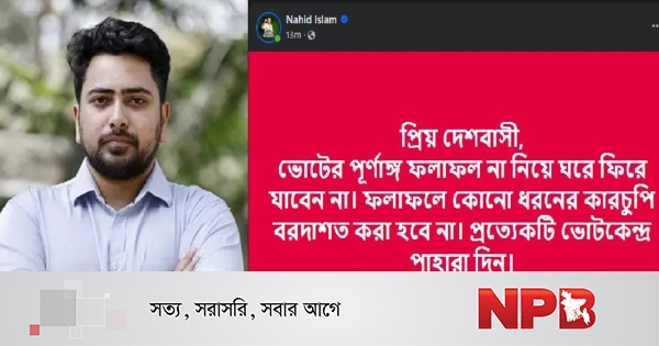 জাতীয় নাগরিক পার্টির (এনসিপি) আহ্বায়ক নাহিদ ইসলাম বলেছেন, ত্রয়োদশ জাতীয় সংসদ নির্বাচনের ফলাফলে কোনো ধরনের কারচুপি বরদাশত করা হবে না।