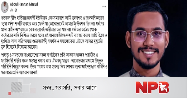 পরে এই অনাকাঙ্ক্ষিত শব্দ ব্যবহার করার জন্য ‘বিব্রত ও দুঃখিত’ উল্লেখ করে ফেসবুক পোস্টে করেছেন হান্নান মাসউদ।