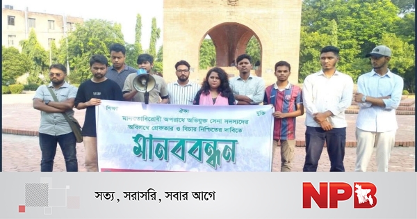 মানবতা বিরোধী অপরাধে অভিযুক্ত সেনাবাহিনীর সদস্যদের অবিলম্বে গ্রেপ্তার ও বিচার নিশ্চিতের দাবি জানিয়ে মানববন্ধন করেছে জাহাঙ্গীরনগর বিশ্ববিদ্যালয়ের শিক্ষার্থীরা।