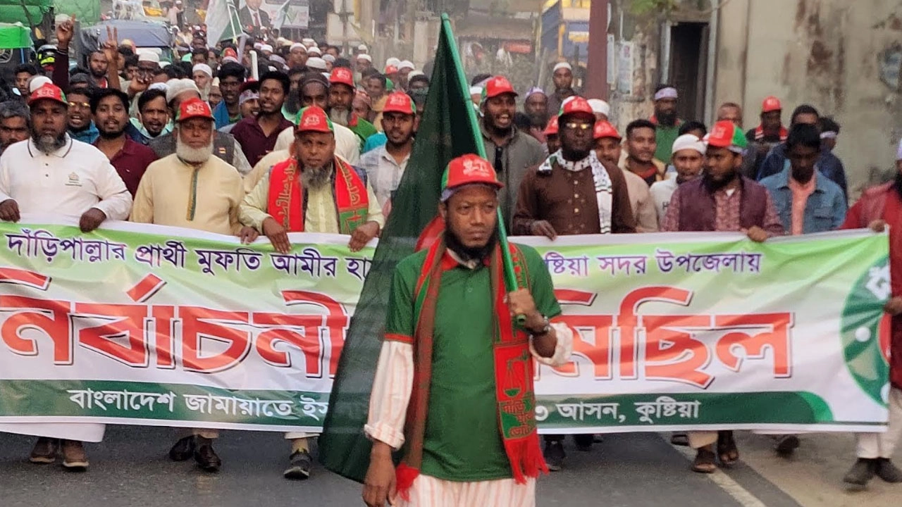 কুষ্টিয়া-৩ (সদর) আসনে জামায়াত মনোনীত সংসদ সদস্য প্রার্থী মুফতি আমীর হামজার নির্বাচনী গণমিছিল অনুষ্ঠিত হয়েছে। সোমবার (৮ নভেম্বর ) বিকেলে শহরের মজমপুর গেট থেকে মিছিলটি শুরু হয়ে বিভিন্ন সড়ক প্রদক্ষিণ করে