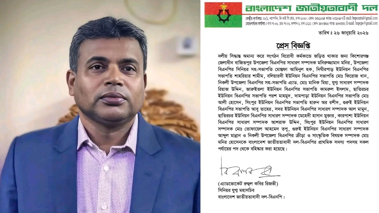 দলীয় সিদ্ধান্ত অমান্য করে স্বতন্ত্র প্রার্থী শেখ মজিবুর রহমান ইকবালের পক্ষে নির্বাচনী কর্মকাণ্ড পরিচালনার অভিযোগে কিশোরগঞ্জের বাজিতপুর ও নিকলী উপজেলার ১৭ জন নেতাকর্মীকে বিএনপি থেকে বহিষ্কার করা হয়েছে। সোমবার (২৬ জানুয়ারি)