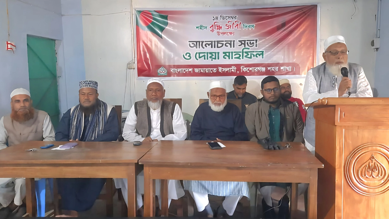 শহিদ বুদ্ধিজীবী দিবস উপলক্ষে বাংলাদেশ জামায়াতে ইসলামী কিশোরগঞ্জ শহর শাখার উদ্যোগে আলোচনা সভা ও দোয়া মাহফিল অনুষ্ঠিত হয়েছে। রোববার (১৪ ডিসেম্বর) সকালে কিশোরগঞ্জ শহরের নগুয়া এলাকায় অবস্থিত আল ফারুক ট্রাস্ট মিলনায়তনে