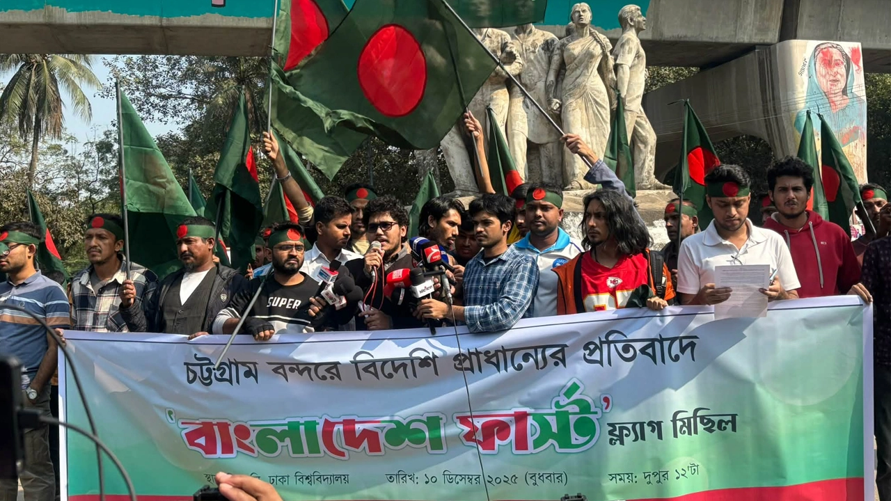 চট্রগ্রাম বন্দরে বিদেশি প্রধান্যের প্রতিবাদে 'বাংলাদেশ ফার্স্ট' ফ্লাগ মিছিল করেছে স্টুডেন্টস ফর সভরেন্টি নামে একটি সংগঠন। বুধবার (১০ ডিসেম্বর) দুপুর সাড়ে ১২ টায় ঢাকা বিশ্ববিদ্যালয়ের (ঢাবি) রাজু ভাস্কর্যের পাদদেশে সংক্ষিপ্ত প্রতিবাদ