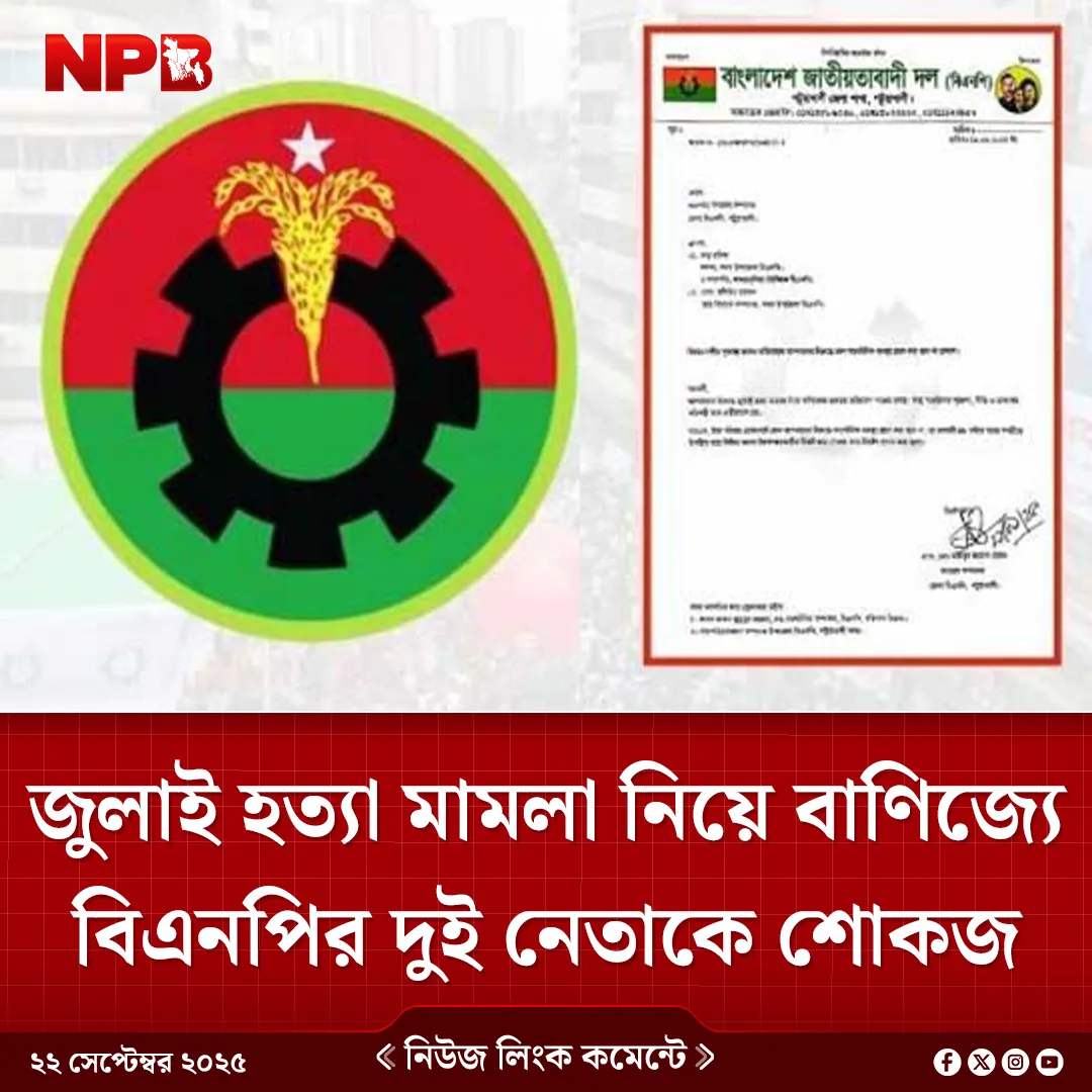 জুলাই হত্যা মামলা নিয়ে বাণিজ্যে: বিএনপির দুই নেতাকে শোকজ