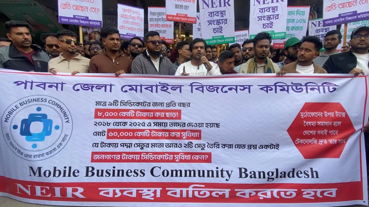 পাবনায় মোবাইল ফোনের সকল দোকান অনির্দিষ্টকালের জন্য বন্ধ ঘোষণা করেছে পাবনা জেলা মোবাইল বিজনেস কমিউনিটি। এনইআইআর ব্যবস্থা বাতিলের দাবিতে বিক্ষোভ মিছিল করেন। সোমবার (৮ ডিসেম্বর) সকাল ১১ টায় পাবনা জেলার সকল