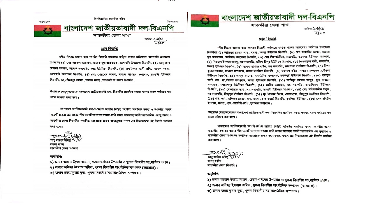 দলীয় সিদ্ধান্ত অমান্য করে সংগঠন বিরোধী কর্মকাণ্ডে জড়িত থাকার অভিযোগে সাতক্ষীরার কালিগঞ্জ উপজেলা বিএনপির ১৭ জন এবং আশাশুনি উপজেলা বিএনপির ৫ জন নেতাকে প্রাথমিক সদস্য পদসহ সকল পর্যায়ের পদ থেকে