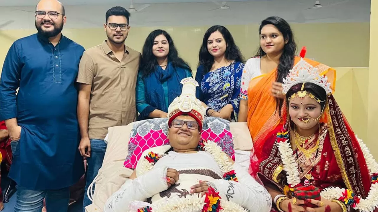 দুর্ঘটনায় আহত হয়ে হাত-পায়ে ব্যান্ডেজ বাঁধা বর আনন্দ সাহা হাসপাতালের শয্যাশায়ী অবস্থায় তার বিয়ের অনুষ্ঠান সম্পন্ন করেছেন।