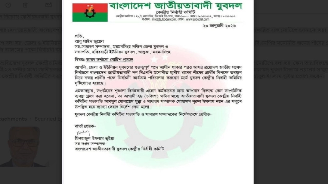 ভালুকায় যুবদল নেতাকে কারণ দর্শানো নোটিশ