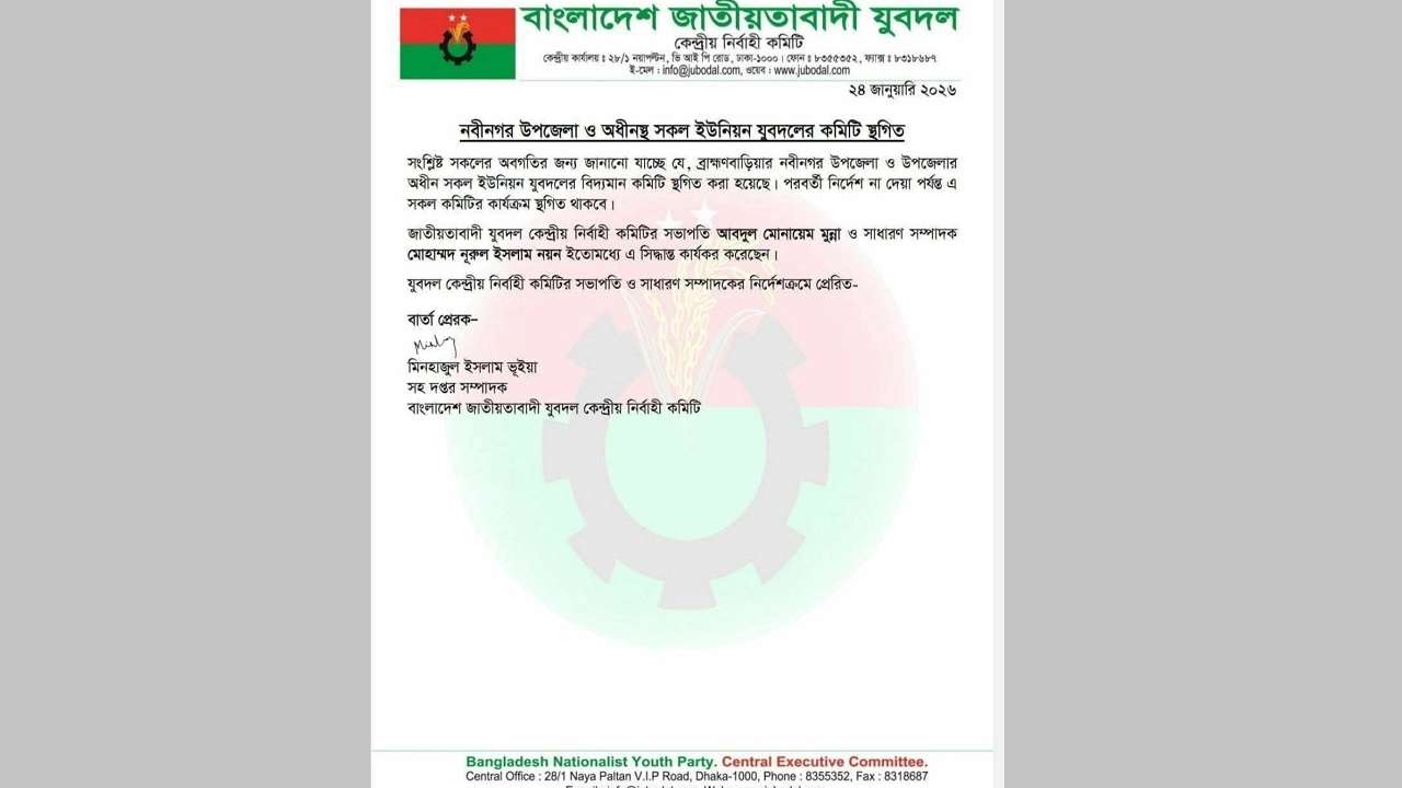 ব্রাহ্মণবাড়িয়ার নবীনগর উপজেলা যুবদলসহ উপজেলার অধীনস্থ সকল ইউনিয়ন যুবদলের কমিটি ও সাংগঠনিক কার্যক্রম স্থগিত করা হয়েছে। বাংলাদেশ কেন্দ্রীয় যুবদলের সহ-দপ্তর সম্পাদক মিনহাজুল ইসলাম ভূঁইয়ার স্বাক্ষরিত এক বিজ্ঞপ্তিতে এ নির্দেশনা দেওয়া হয়।