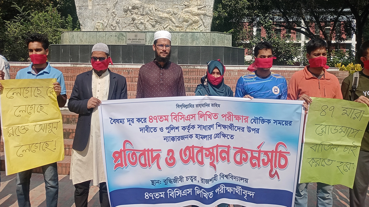 রাবিতে মুখে লাল কাপড় বেঁধে ৪৭তম বিসিএস লিখিত পরীক্ষা পেছানোর দাবি