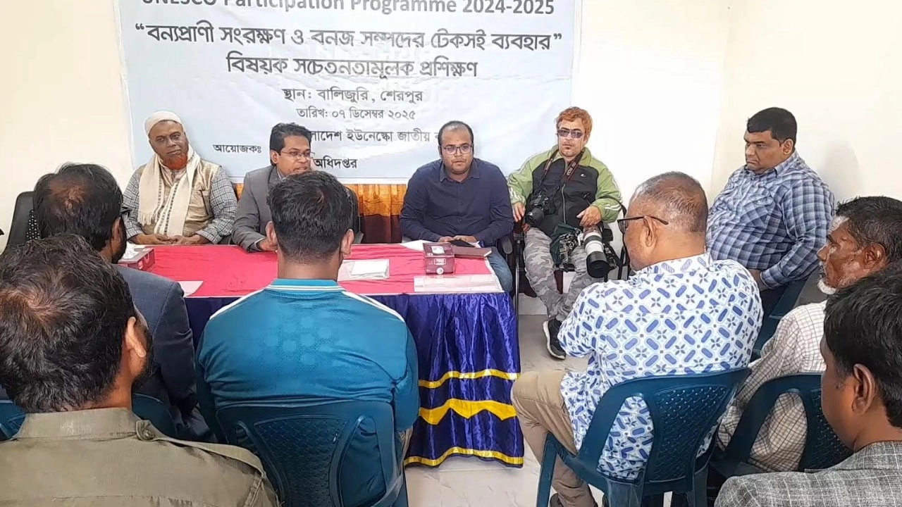 শেরপুরে বন্যপ্রাণী সংরক্ষণ ও বন সম্পদের টেকসই ব্যবহার শীর্ষক সচেতনতামূলক প্রশিক্ষণ অনুষ্ঠিত হয়েছে। রবিবার (৭ ডিসেম্বর) দিনব্যাপী শ্রীবরদী উপজেলার বালিজুরীর বনবিভাগের ডরমিটরিতে বাংলাদেশ ইউনেস্কো জাতীয় কমিশন ও বন অধিদপ্তরের যৌথ উদ্যোগে