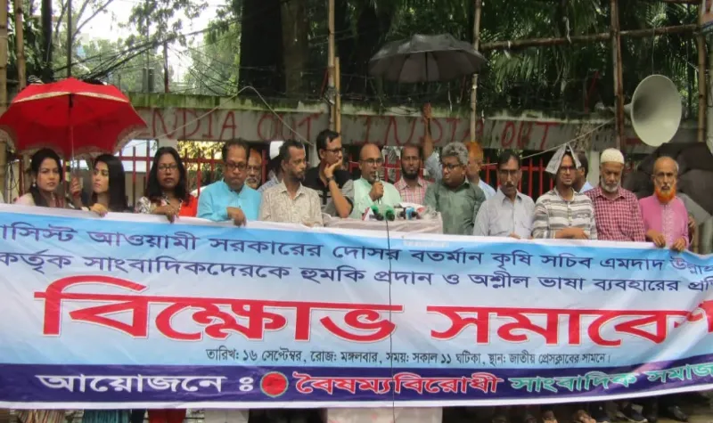 সার আমদানিতে ব্যাপক অনিয়ম ও দুর্নীতির অভিযোগের সংবাদ প্রকাশের জেরে গণমাধ্যম কর্মীদের হুমকি দেওয়ার প্রতিবাদে কৃষি সচিব এমদাদ উল্লাহ মিয়ানের বিরুদ্ধে বিক্ষোভ সমাবেশ করেছে ‘বৈষম্যবিরোধী সাংবাদিক সমাজ’।
