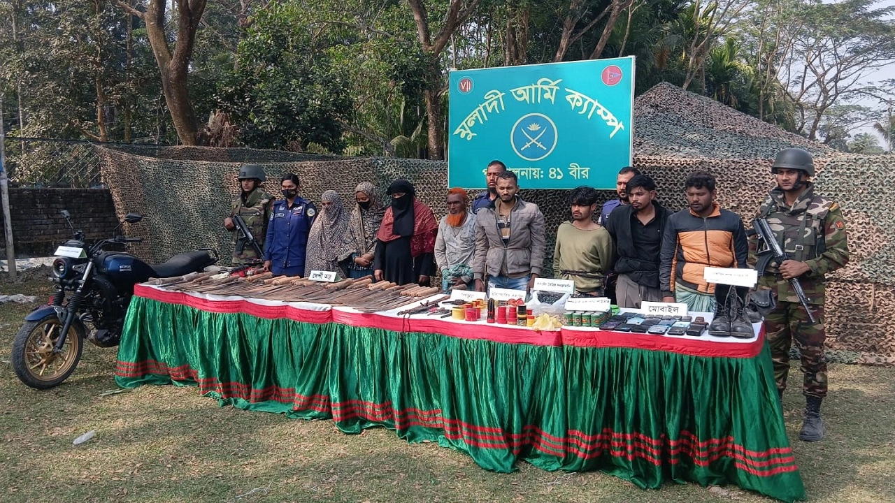 বরিশালের মুলাদী উপজেলায় সেনাবাহিনীর অভিযানে একটি আগ্নেয়াস্ত্র, বিপুল পরিমাণ দেশীয় অস্ত্র এবং হাতবোমা তৈরির বিস্ফোরক ও সরঞ্জাম উদ্ধার করা হয়েছে। এ ঘটনায় নারীসহ আটজনকে গ্রেপ্তার করা হয়েছে। বুধবার (২৮ জানুয়ারি) দুপুরে