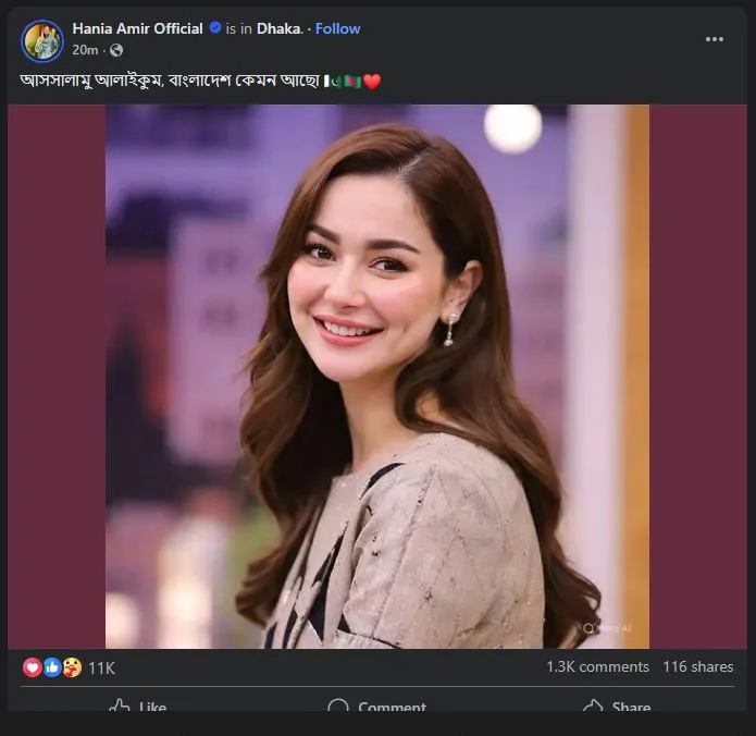 পাকিস্তানি অভিনেত্রী হানিয়া আমির ঢাকায়, অনুষ্ঠান সূচি জানা গেল