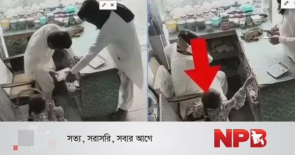 ভিডিওতে দেখা যায়, দোকানের কাউন্টারের পেছনে বসে আছেন দোকানদার এবং তার চার বা পাঁচ বছরের কন্যা।